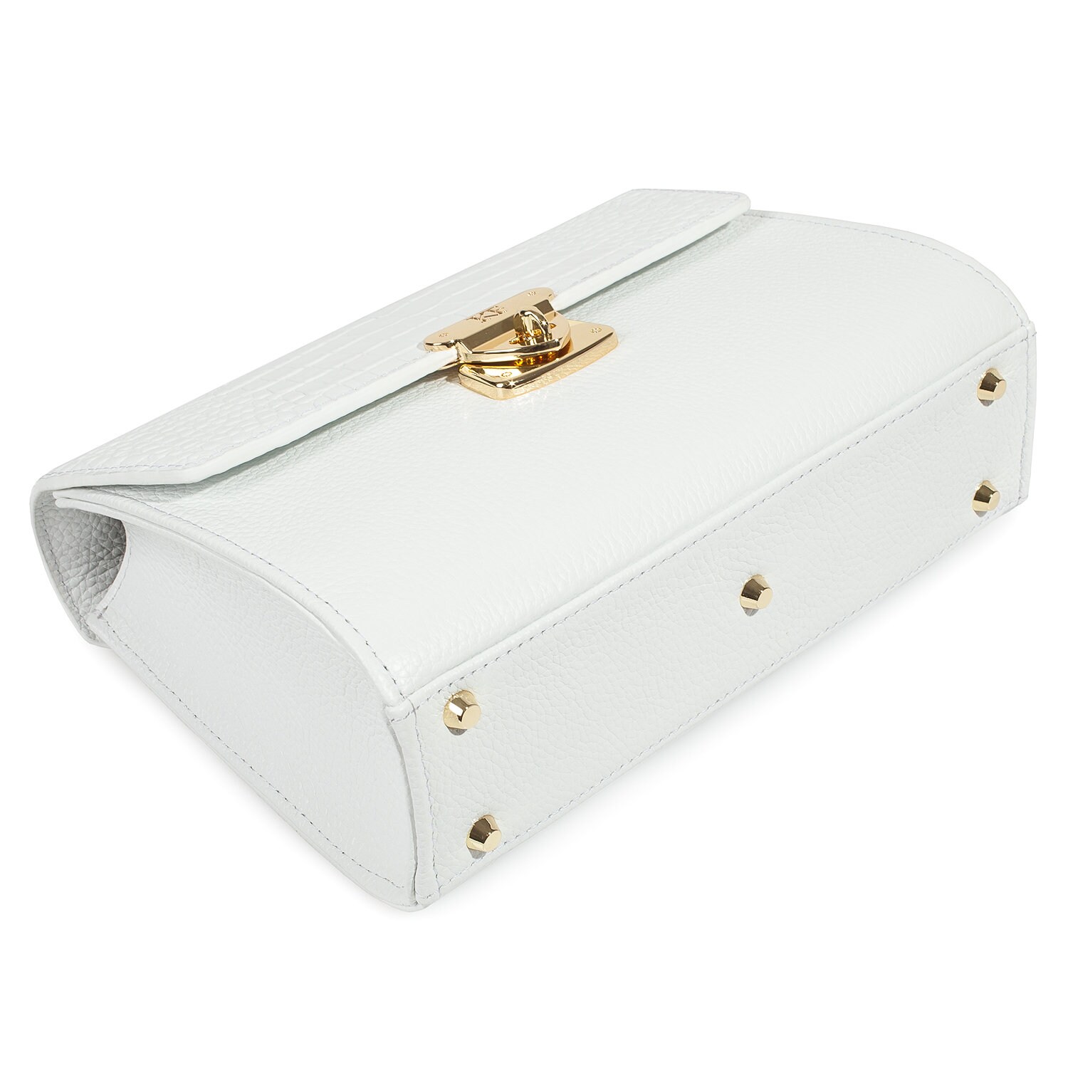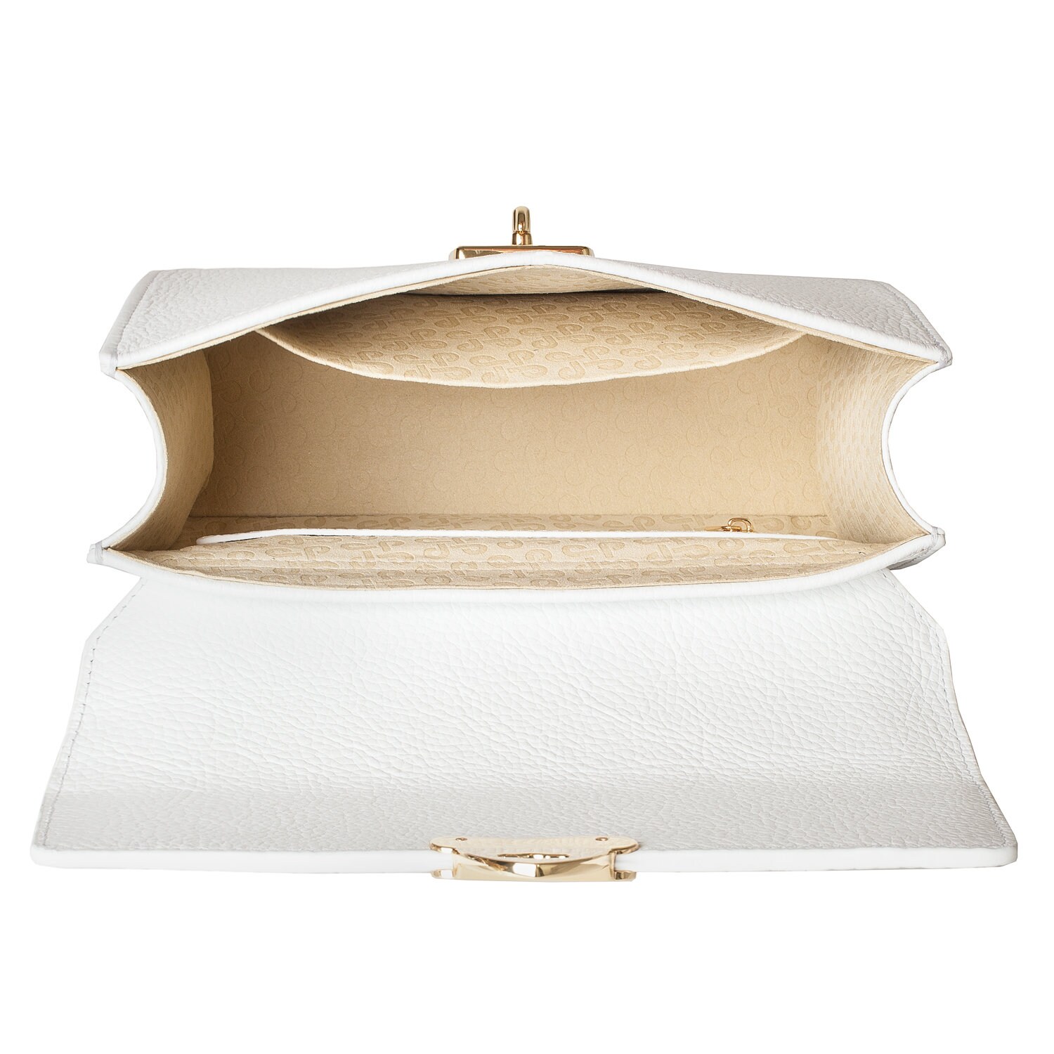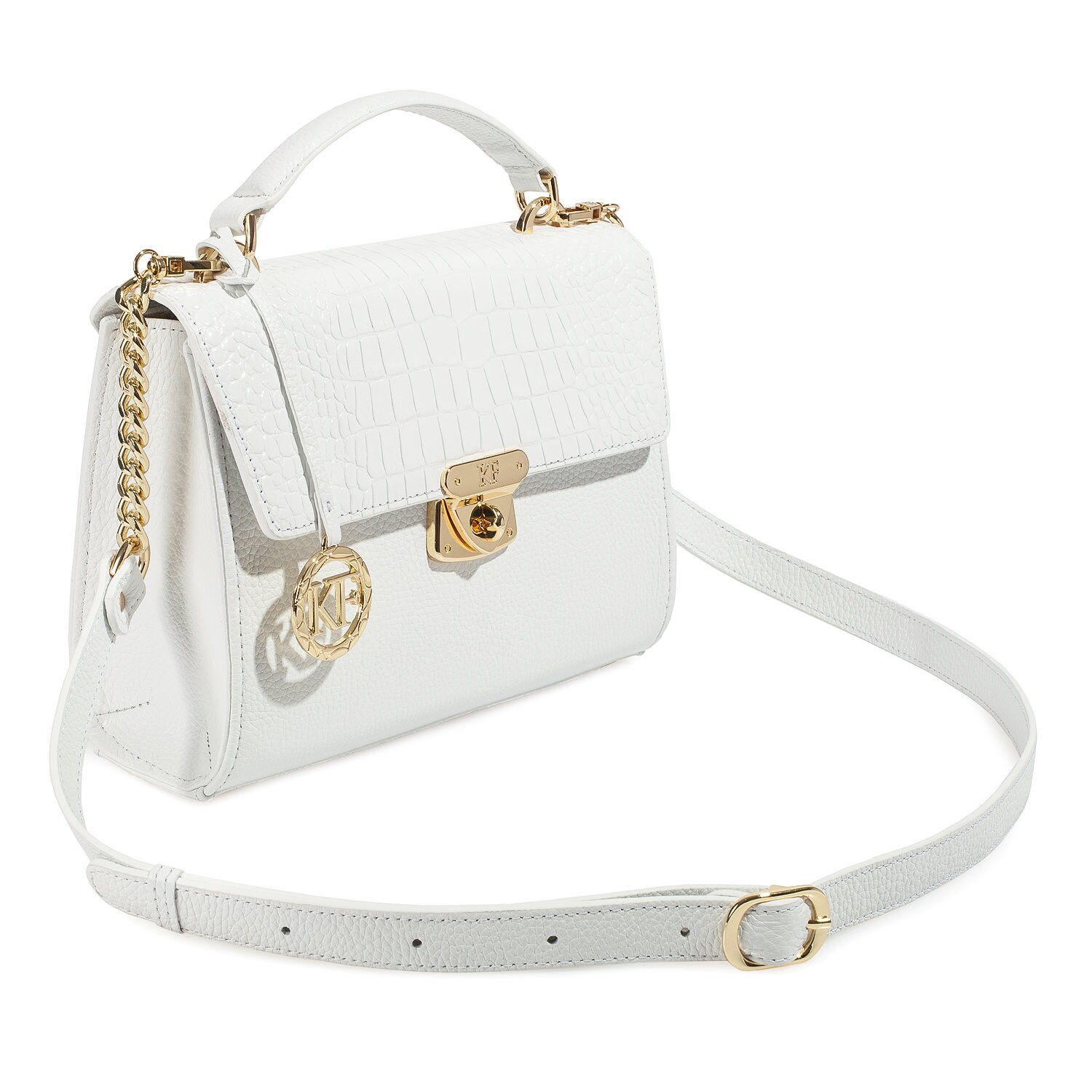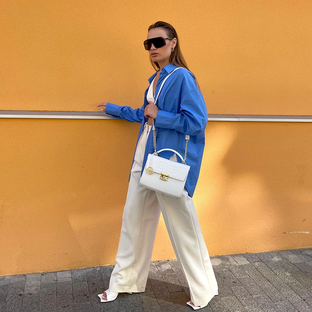 White genuine leather handbag from ukrainian designer Katerina Fox. The internal space of a bag is equipped with three spacious compartments and two patch-pockets and one zipper pocket. One of the spacious compartments is closed with a zipper. The bag is closed with a clasp. The bottom of the bag is protected with metal legs. There is a long handle that allows you to wear the bag on the shoulder. The kit also includes a storage bag.