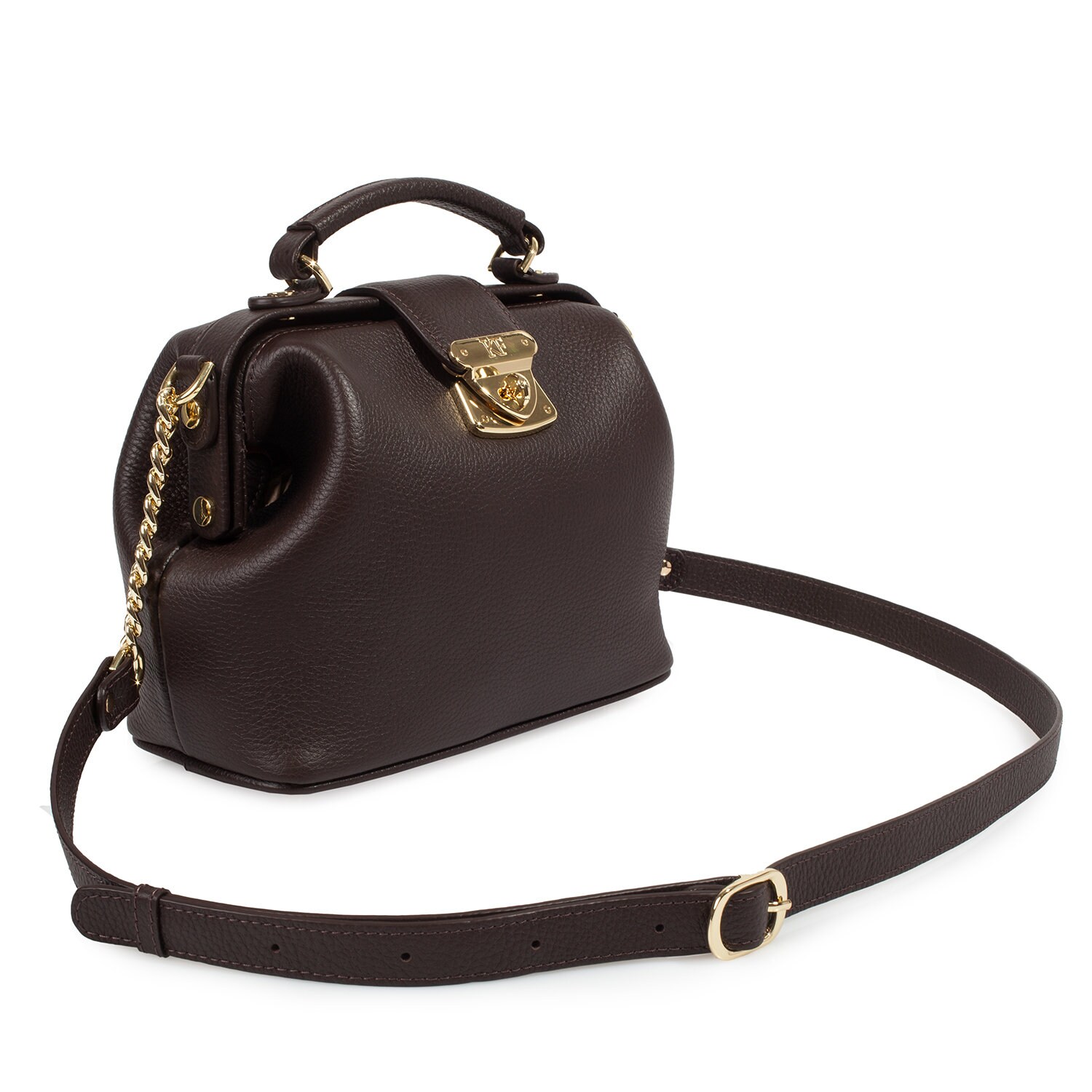 Women's leather bag made of genuine leather, hardware with galvanic coating and microfiber lining. The internal space of a bag is equipped with three compartments, one compartment and two side pockets, one with a zipper. §³loses with 3 magnet buttons. The bottom of the bag is protected with metal legs. There is a long handle that allows you to wear the bag on the shoulder. The kit also includes a storage bag.
